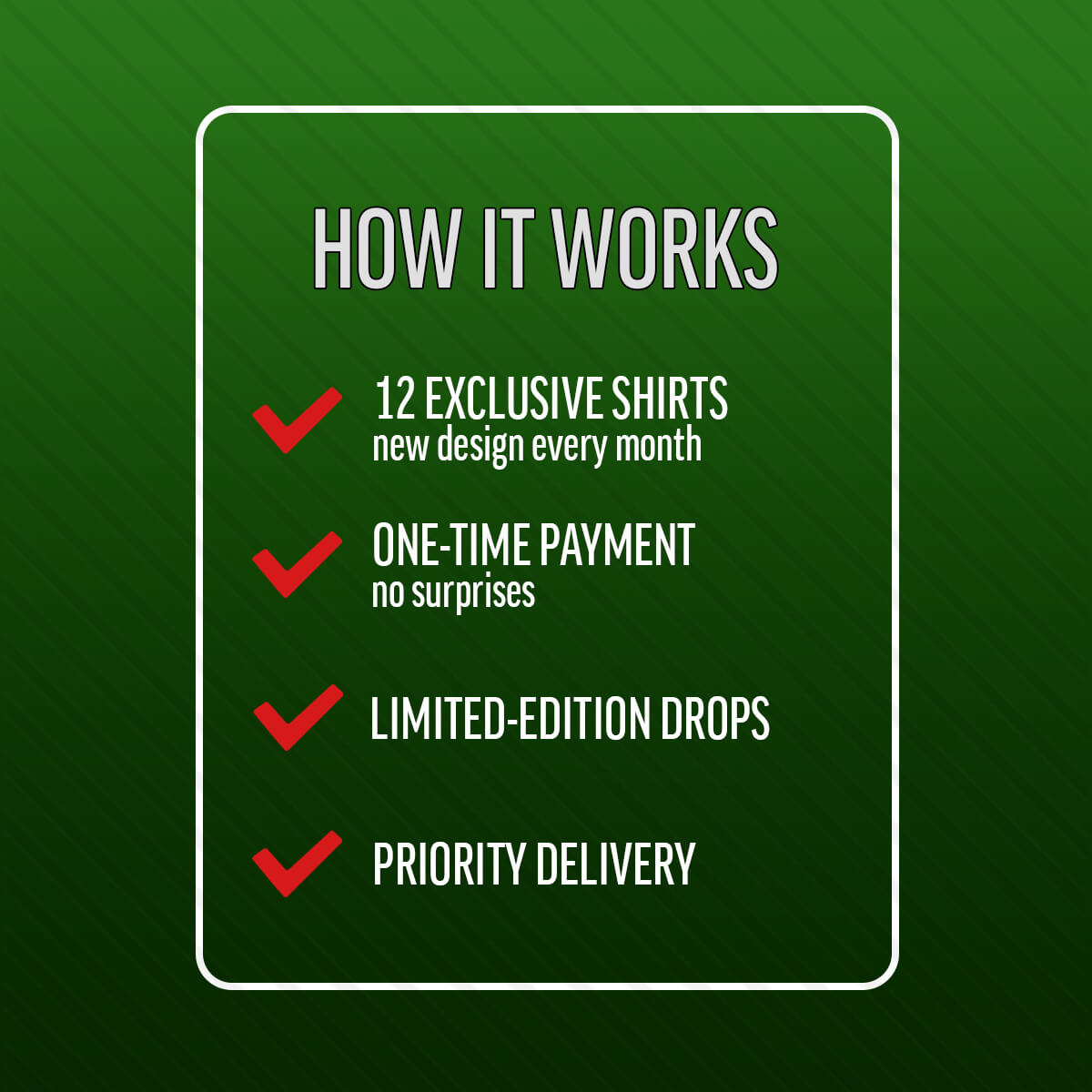 With the Hardcore Shirt Club Gift Pack, your recipient will get 12 exclusive Hardcore Italians T-Shirts. One brand-new design ships every month for a full year. Each shirt comes in our best-selling unisex fit and is never re-stocked, making every delivery a true collectible.