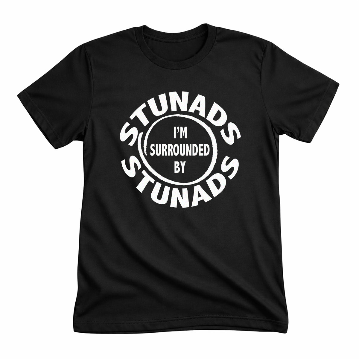 Nel mondo non mancano gli "stunadi" (idioti)! Fatti una bella risata da amici e parenti con la maglietta Surrounded By Stunads.